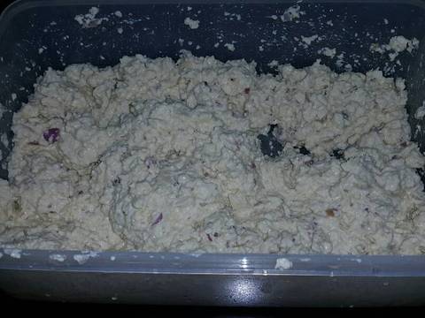 1. Remat remat tahu lalu campurkan bumbu yang sudah dihaluskan lalu tambahkan garam dan penyedap rasa. Remat remat kembali sampai semua tercampur rata, tes rasa.