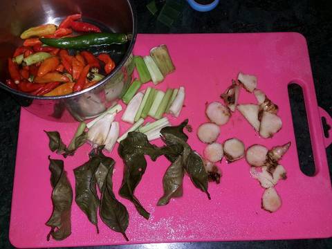 6. secukupnya cabai rawit merah gelundungan, salam, laos, serai, garam, dan penyedap