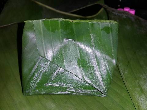 4. Tempatkan daun pisang pada telapak tangan, letakkan 1 lembar daun salam, 2 batang serai yang dimemarkan masing masing ukuran 2 cm, 1 keping potongan laos lalu tindih dengan tahu, masukkan 3 buah cabai rawit merah di tengah tahu dan tutup daun pisang sesuai selera bentuknya lalu sematkan dengan stepler atau tusuk gigi. Lakukan sampai semua tahu habis terbungkus.